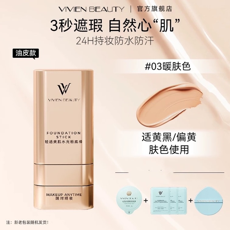 【中國直郵】 vivien beauty 輕透亮採粉底棒 韓女同款 10s速成懶人妝 遮瑕神器 輕鬆打造水光肌#03暖膚色 1支裝