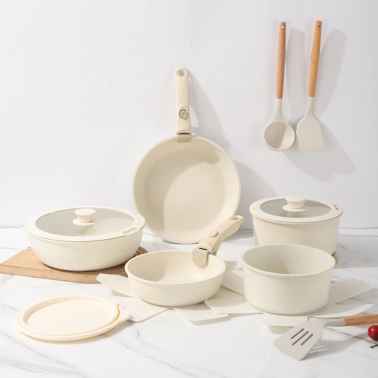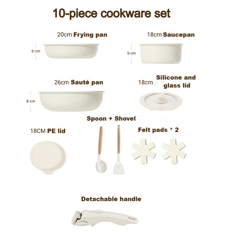 扶桑 【白色極簡】不沾鍋具10件組 可拆卸把手 矽膠鍋鏟湯匙 收納整潔 不黏易清洗 附隔熱墊 白色