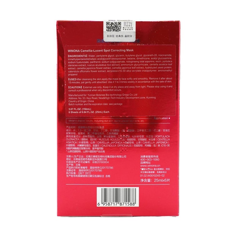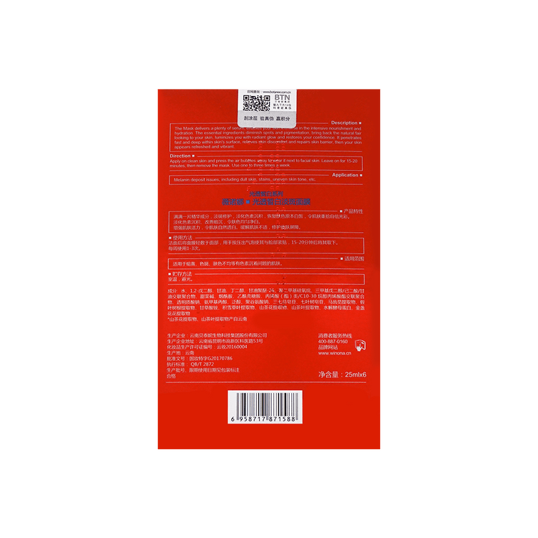 WINONA薇諾娜 光透皙白淡斑面膜 美白 改善暗沉 淡化痘印 25ml*6片入