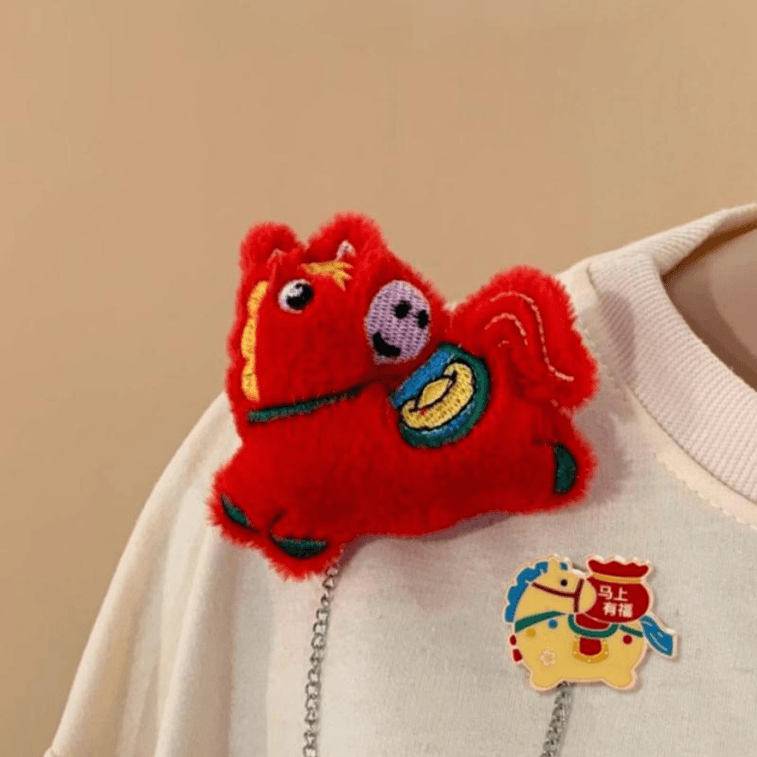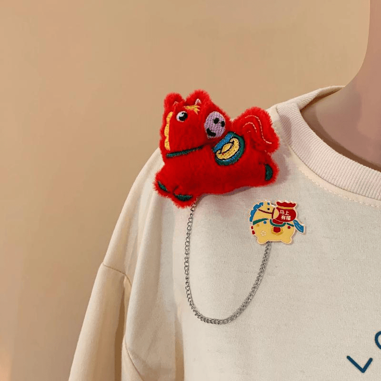 【中國直郵】 西塢 馬年卡通鏈條可愛中國風毛絨胸針衣服圍巾配件別針紅色小馬馬上有福8cm*1件