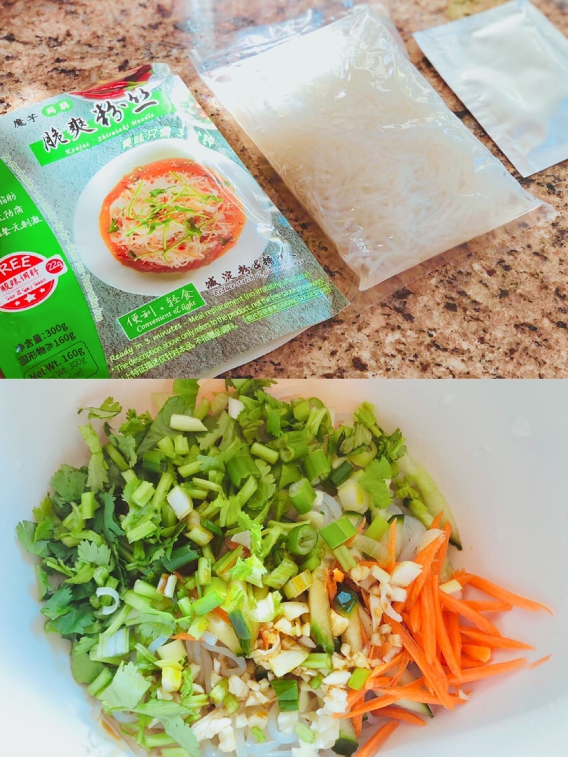 🪴打开包装有一包魔芋粉和一包调料汁,按照说明用清水将魔芋粉冲洗一下,或者先用白醋加清水浸泡三分钟再冲洗,口味更佳。所以我先用白醋泡了几分钟,然后用清水冲洗干净,淋干水分,加入黄瓜丝胡萝卜丝和蒜末葱花香菜,倒入自带的调料汁,搅拌均匀即可。