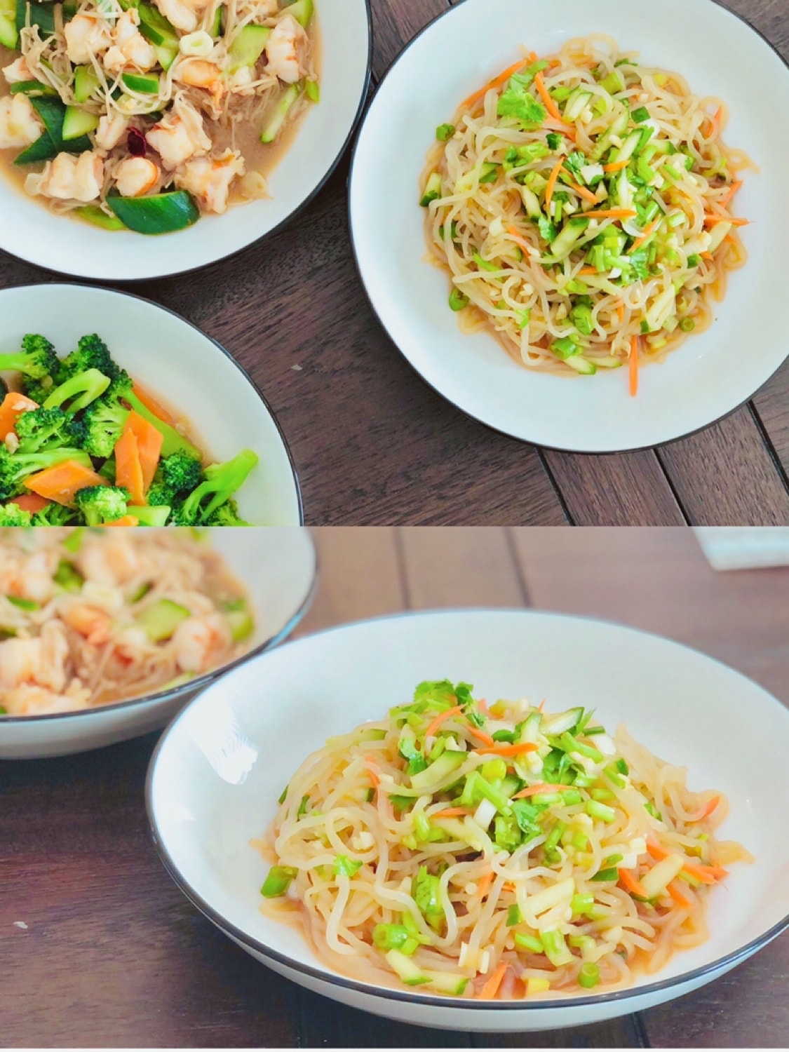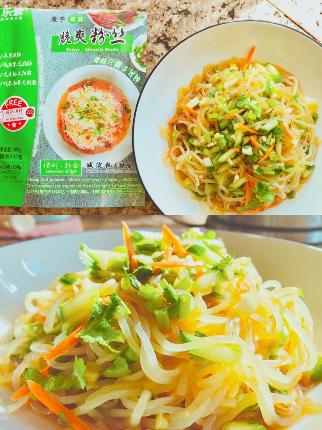 🪴Open the package with a pack of konjac flour and a pack of seasoning juice, rinse the konjac flour with water according to the instructions, or soak it in white vinegar and water for three minutes before rinsing, the taste is better. So I soaked it in white vinegar for a few minutes, then rinsed it with clean water, drained the water, added shredded cucumber, shredded carrots, minced garlic, scallions, and coriander, poured in the sauce that came with it, and stirred it evenly.