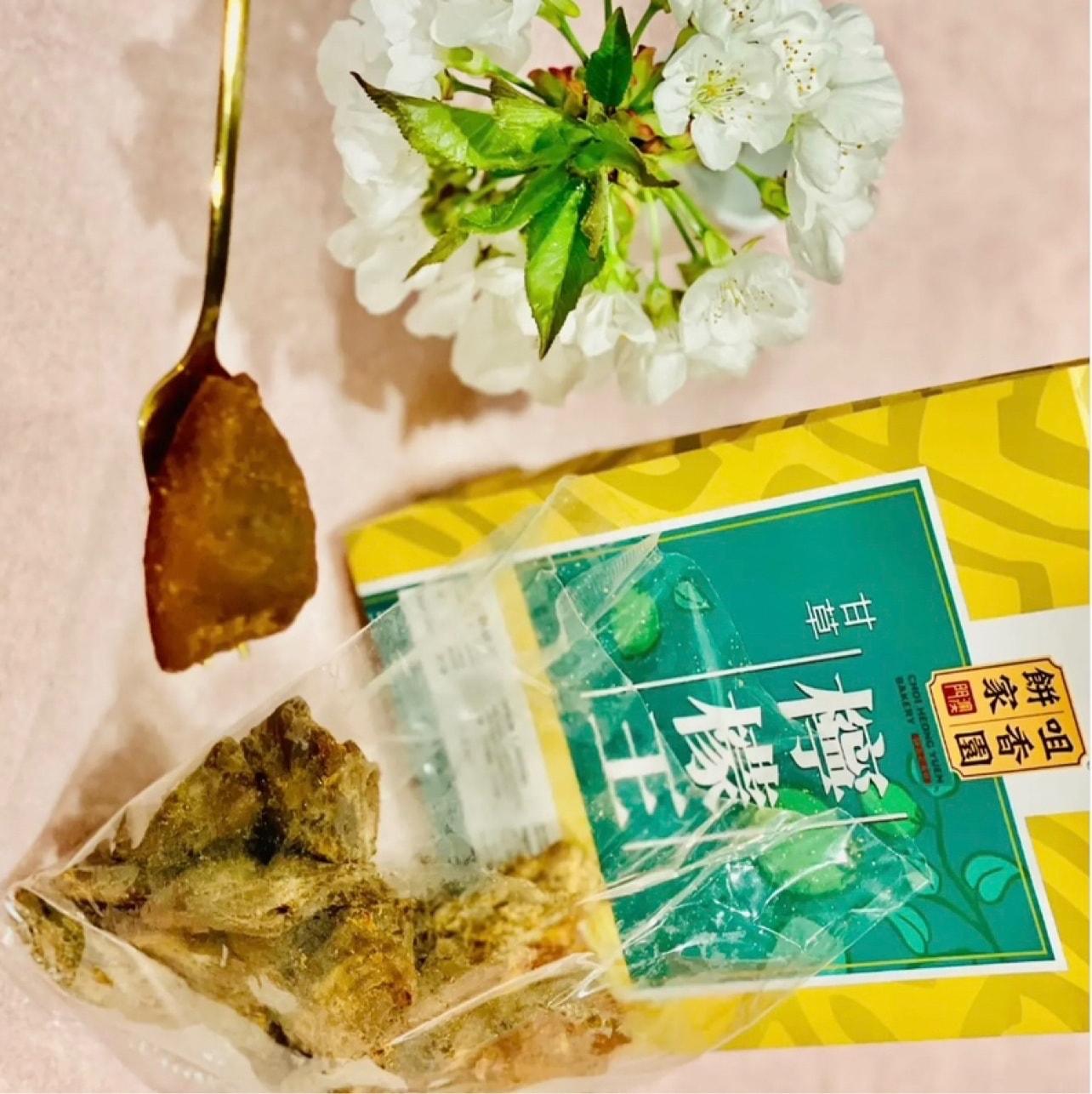 澳门咀香园饼家的,甘草柠檬王果脯蜜饯,介绍的主要功能是:可去痰止咳、清热解毒,净含量 180 克,购入价 3.69 美元,原价 7.39 美元;打开呈棕黄色,味道酸甜可口有嚼劲,过敏嗓子不舒服时,能够暂时缓解疼痛、生津润喉;原料成分主要有:甘草粉、柠檬、盐、糖、食用糖精、甜味剂、酸味剂、防腐剂。