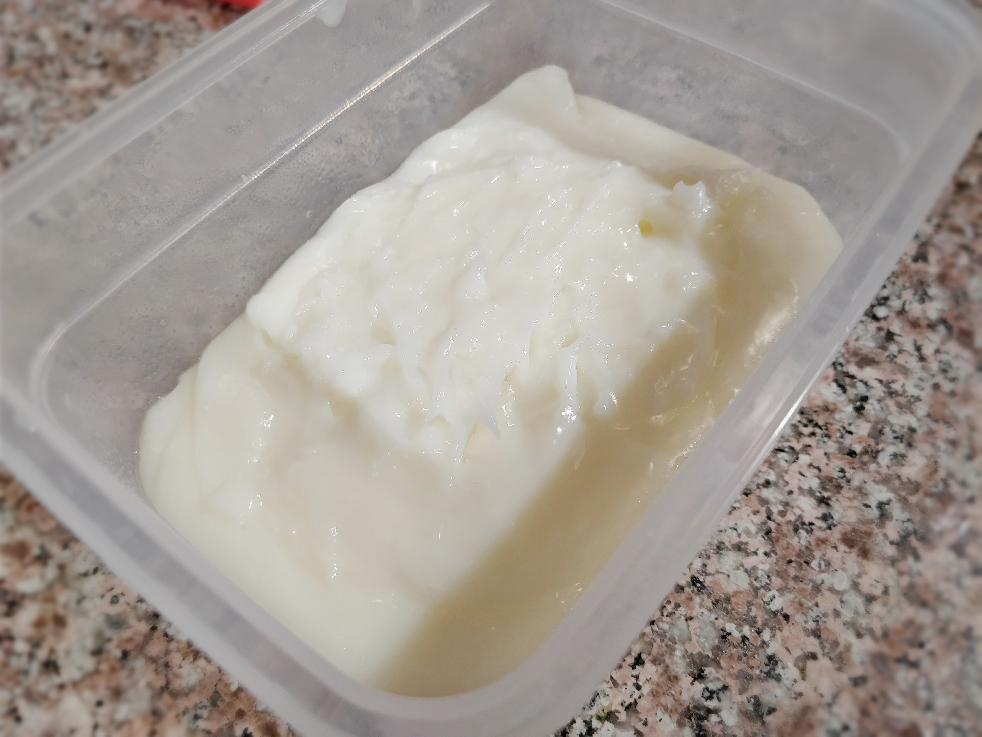 2. 保鲜盒里抹一层薄薄的油防粘,把锅内的牛奶糊糊倒入保鲜盒中,放到冰箱冷藏过夜(凝固大概需要三个小时左右,过夜就不用管时间啦~)