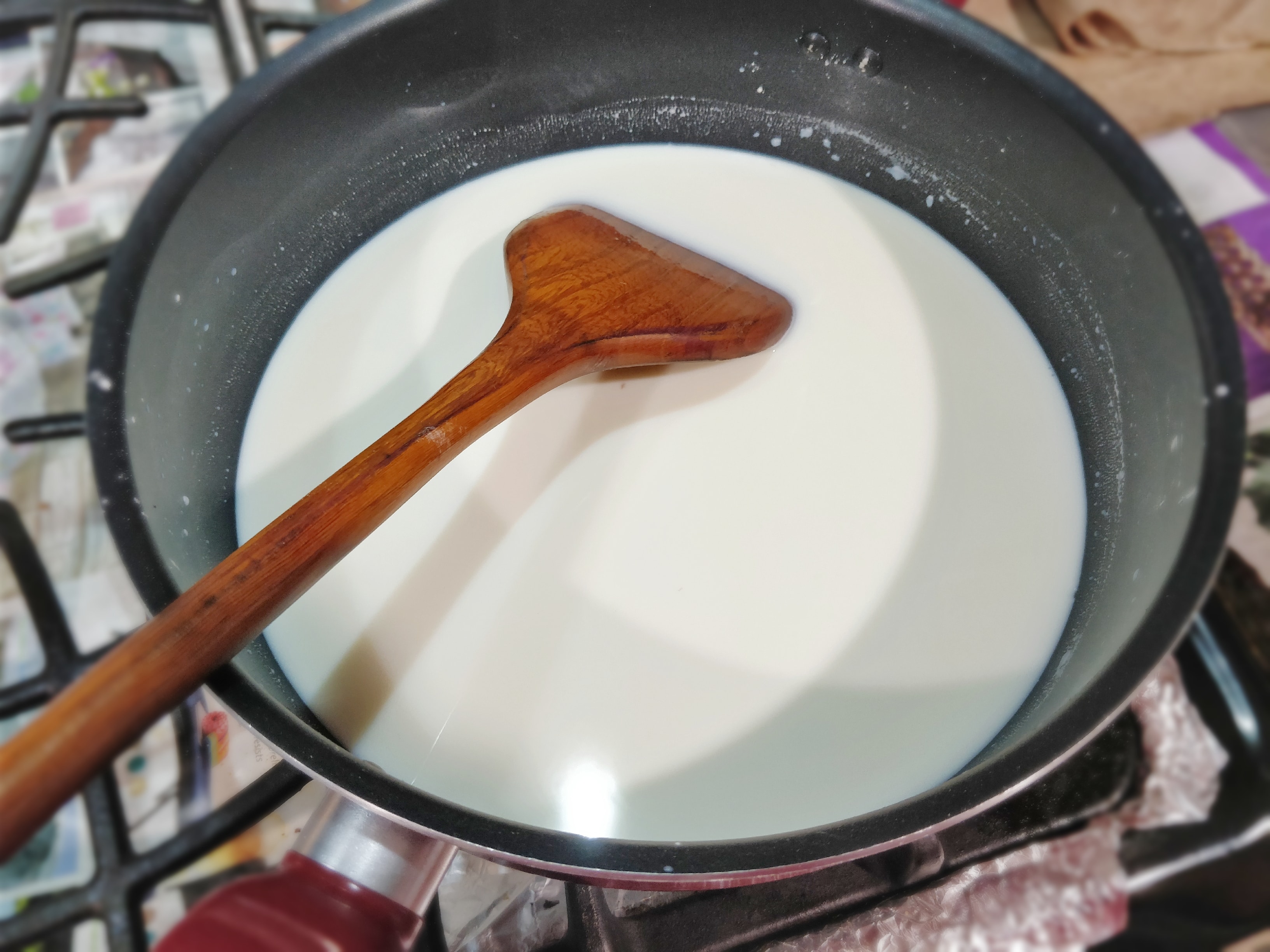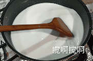 1. 把牛奶,玉米淀粉,炼奶,白砂糖全部倒入不粘锅中,先搅拌一下让它们混合之后再开小火不停搅拌,一直到它开始凝固成糊糊状。