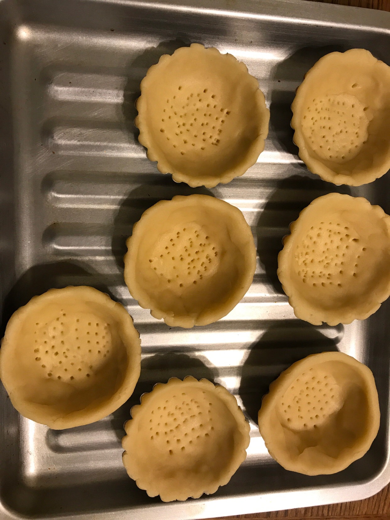 把面团从冰箱拿出来,擀好、用杯子盖出符合模具大小的挞皮,放模具后用叉子扎孔;放烤箱里355华氏度烤10分钟