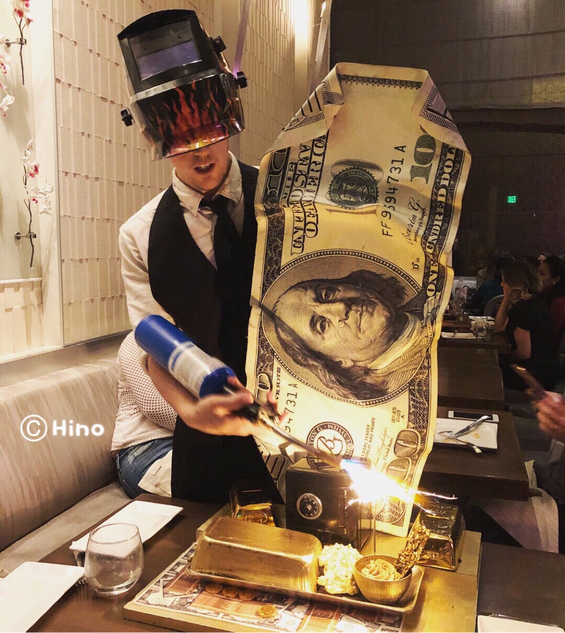 Dolla Dolla 甜点超级吸睛,服务生端着巨型钞票登场带上防护镜随着点燃蜡烛,巧克力慕斯的金色外皮随之融化,配着里面的奶油和脆粒入口绵中带着巧克力醇香🍫🍮
