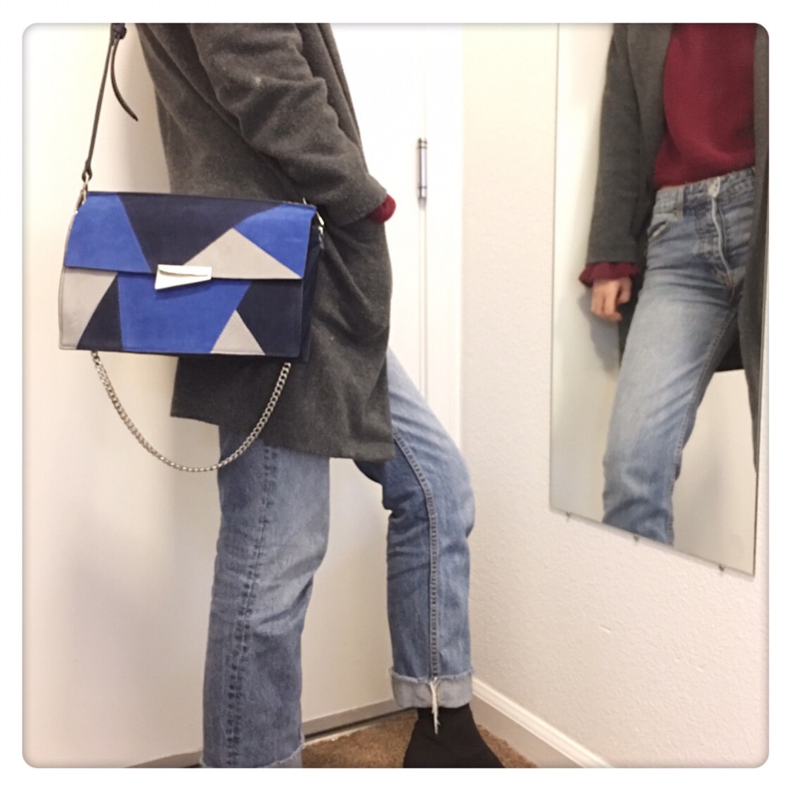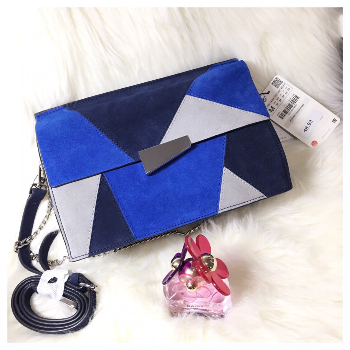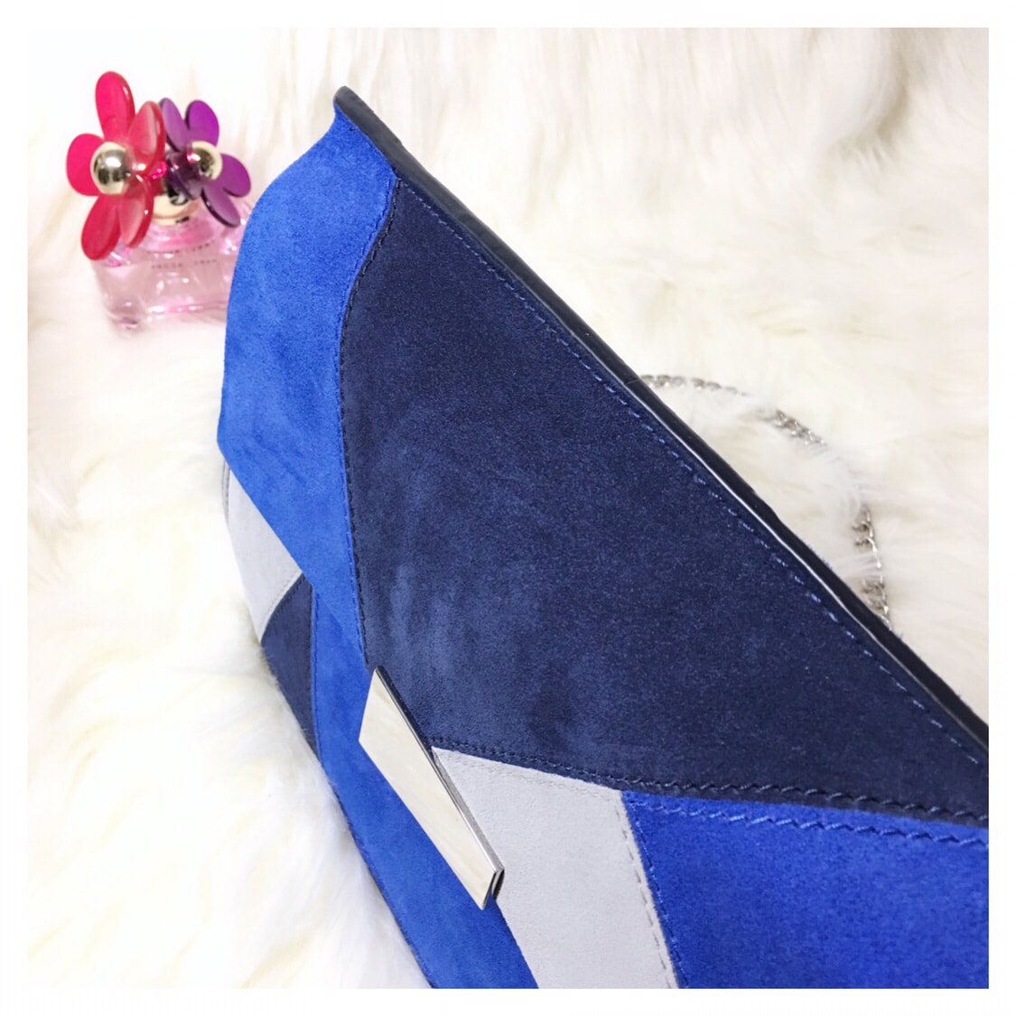 🌹🌹在官网一眼看中的,是这个包的几何拼图风格😜😜亮丽夺睛的宝蓝色,和黑色灰色的各种直线的几何线条穿插斜掠,视觉分布很舒服,再配上不规则形状的也是直线条的金属色搭扣,层层呼应,虽是整体冷色调,却恰恰因为这些冷色和几何线条的搭配反而显得跳脱生动有活力,并且活泼的恰到好处适可而止,反而可以想象如果真是暖色调就会显得过于闹腾了🤣🤣🤣所以这样的冷色调,刚刚好😀😀