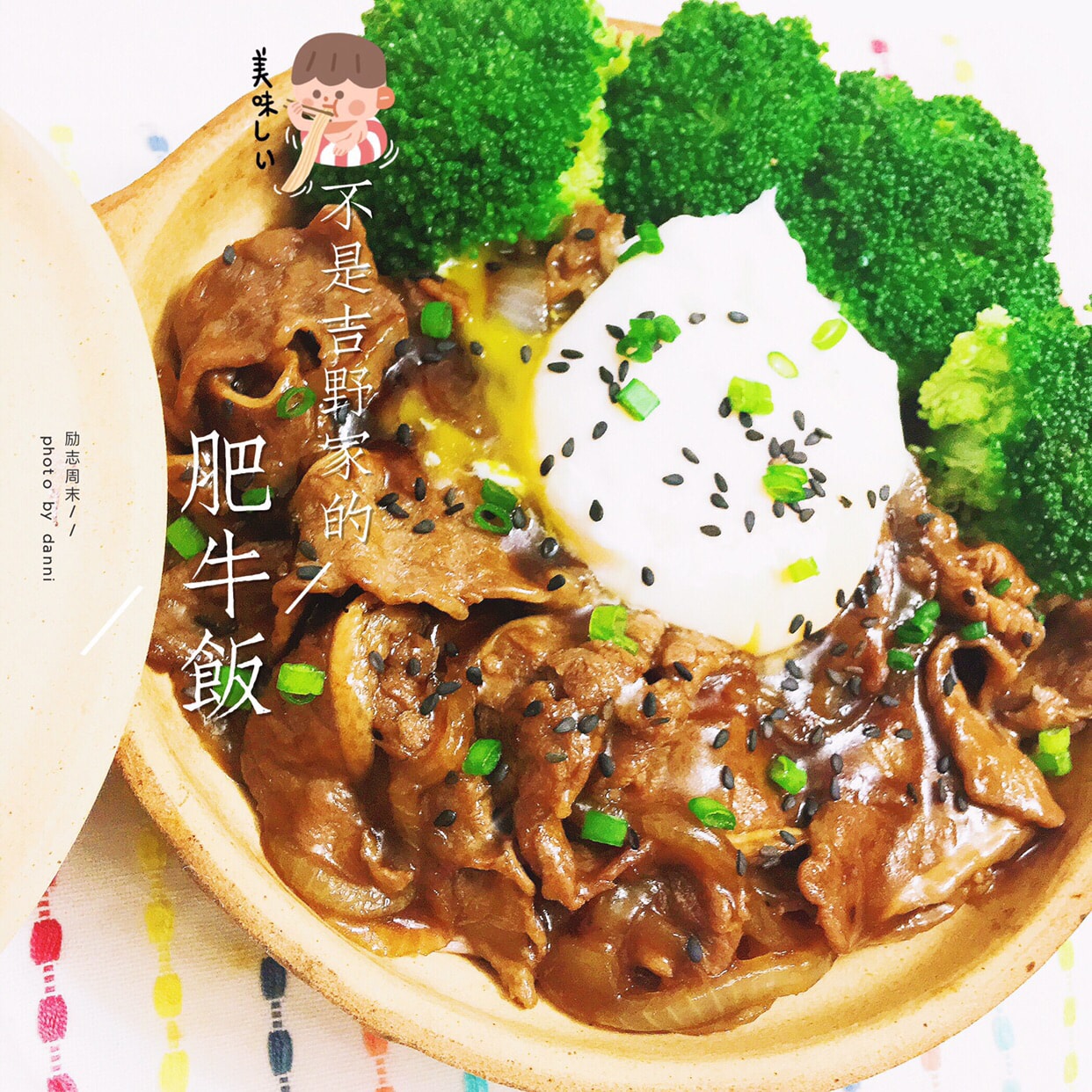 step4.盛一碗米饭把刚才做好的肥牛放上去,再摆上西兰花和温泉蛋,撒点芝麻做装饰。一碗好吃的肥牛饭就做好啦~🤤